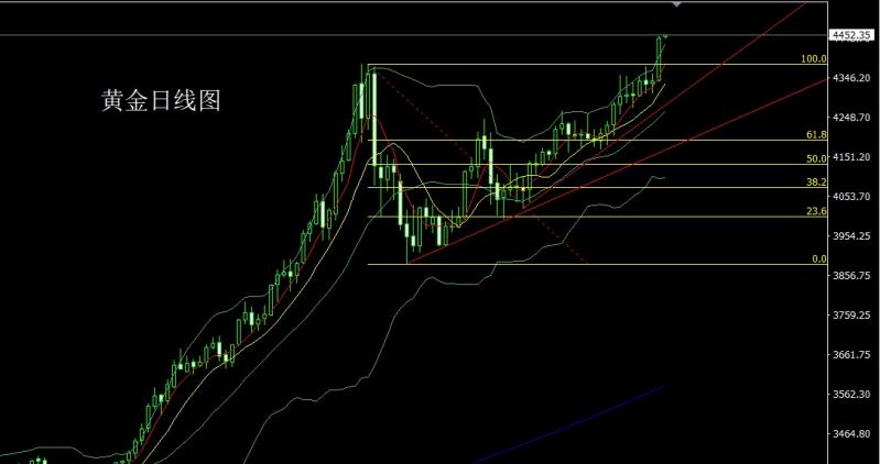黄金市场昨日早盘开盘在4339.9的位置后行情小幅回踩给出4337.5的位置后行情强势震荡拉升,破位前期历史高点4381的位置后行情完成大级别N字破位加速上行,日线最高触及到了4449.3的位置后整理,日线最终收线在了4443.4的位置后行情以一根上影线稍长的大阳线收线,而这样的形态收尾后,今日的行情依旧有看多需求,点位上,下方3325和3322的多和3368-3370的多和3377和3385多和3563的多减仓后止损跟进在4000持有,前一周4176和4174的多和4187和4184的多以及4208和4205多止损跟进在4260持有,上周4310的多减仓后止损放到4350,今日的行情早盘直接拉升,一会4448多止损4443,目标看4462和4473和4485和4493和4500关口