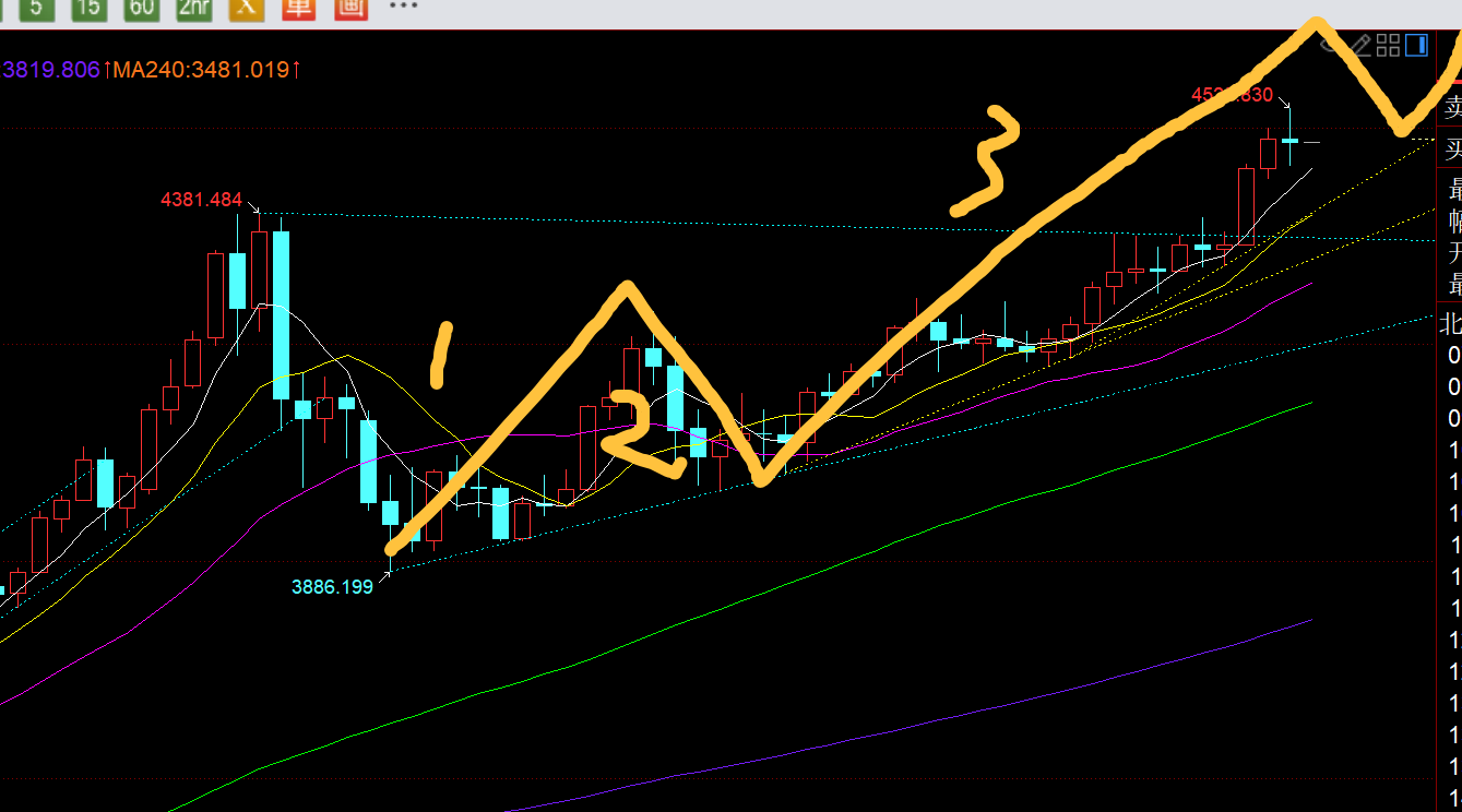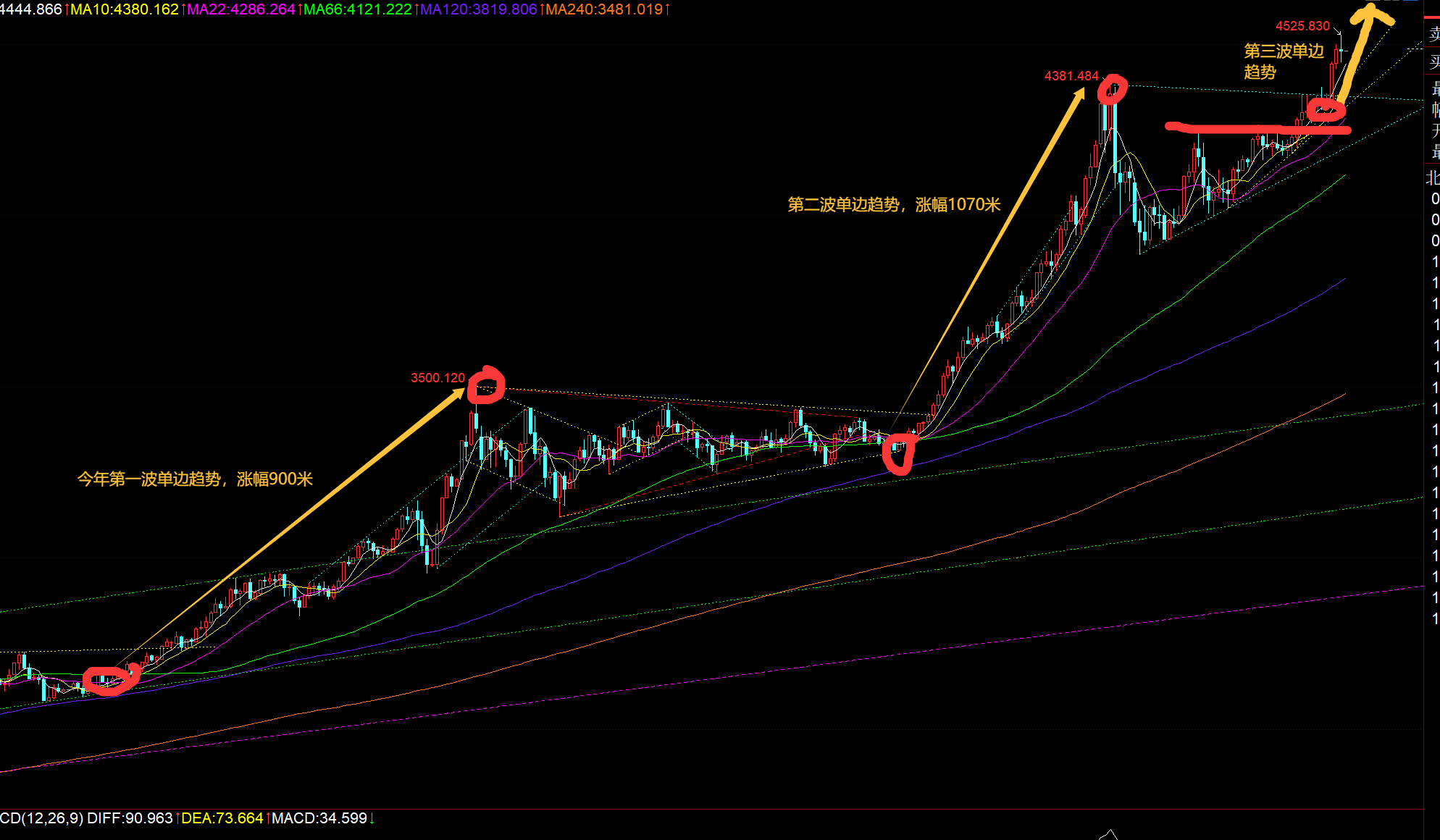 第二,黄金日线级别,从近期走势浪形来推算,以3886作为第一浪启动点,目前进行的是第三浪,按照1.618倍正常来推算,高点至少可以试探4577; 而从4381-3886的1.382倍扩展位来算,可以指向4569,这也是近期给出下一个多头趋势目标4569-4577的由来;因此,当前的收盘价格,向上还有100米空间可以强势冲一下,之后承压就要考虑一波四浪回调,短暂回调之后再继续走第五浪拉升;当然也不排除一点,就是三浪走衍生浪,突破趋势目标继续向上强拉;所以不管如何,不要小觑大牛市的威力;
