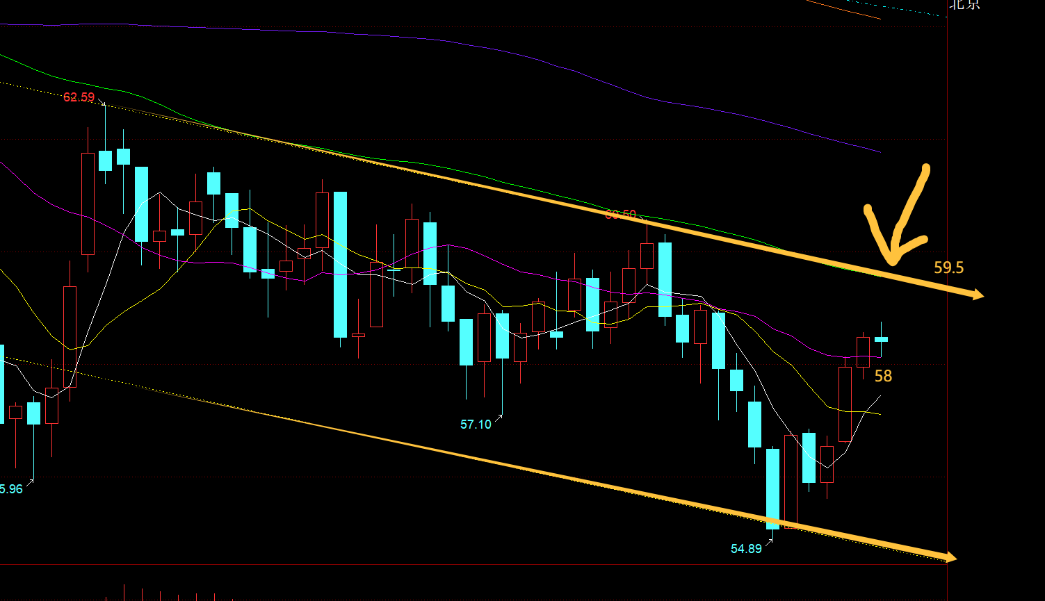 原油方面:日线级别下行通道上轨强压是59.5,此位置下仍看跌为主,中轨支撑58,目前还处于上方,处于反弹中,一旦哪天收盘回到中轨之下,则会走弱; 小时线级别通道,留意58.6阻力,58.1支撑,关注这个小范围的得失,若向上突破站上,那么试探59.5看承压;若向下跌破有效,则会提前走弱下行;