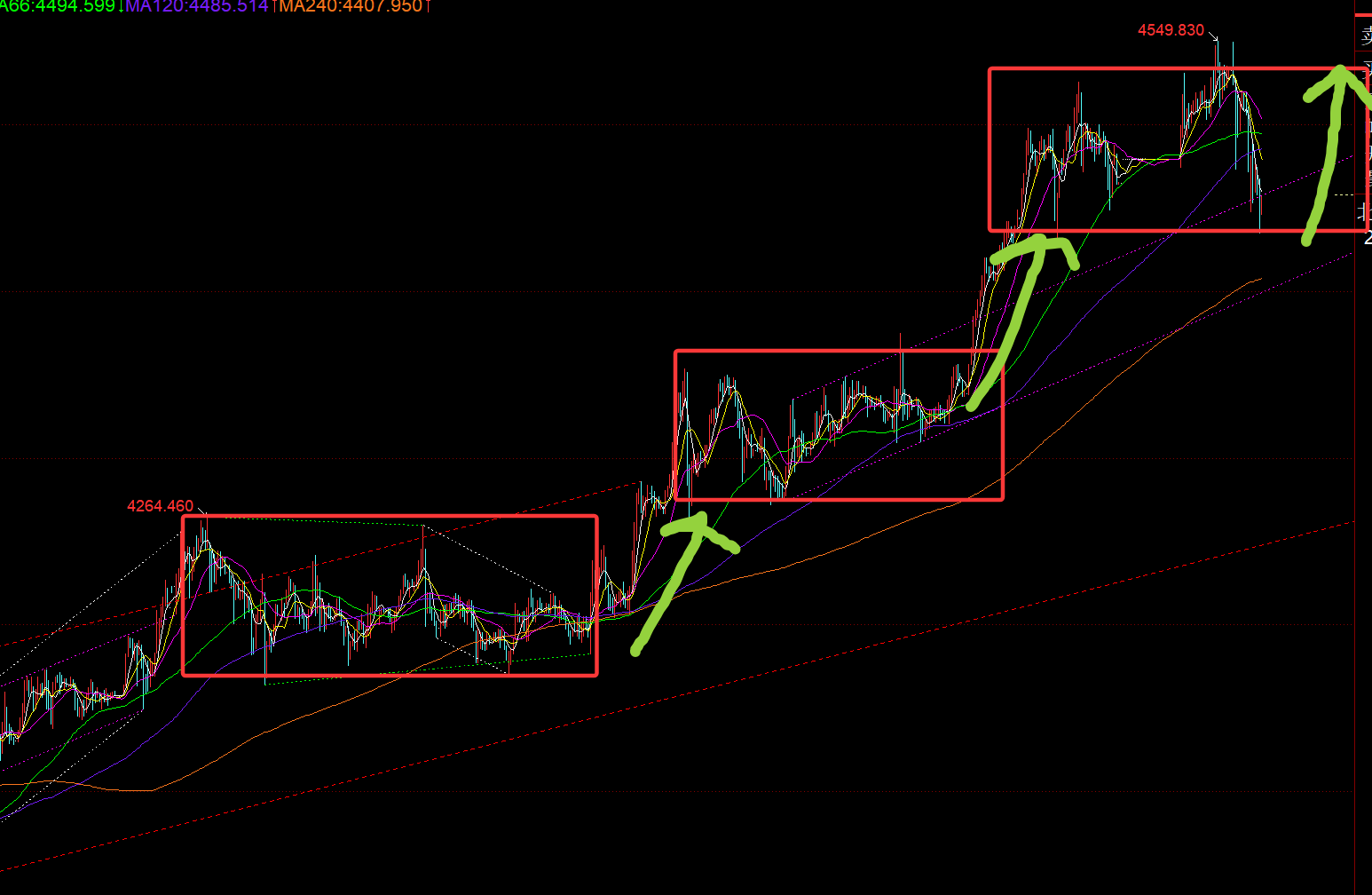 第一,黄金方面:上周五依旧是早间循环先续涨强势拉升,周三隔夜指出的4476看涨,顺利拉升,并且早间也继续尝试续涨对待,4510跟随看涨,拉升至4530逢高出货;午后回踩顶底支撑4500再次看涨,拉升至4517上出货,最高4550;美盘回踩4515再尝试看涨,再次拉升4530,今日早间还是先续涨抵达4550;