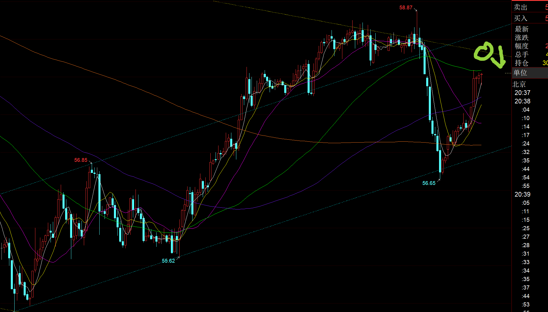 原油方面:蓝色通道下轨支撑,又是一步到位的反弹,今晚去测试前期黄色通道上轨阻力58.3附近反压如何,若持续压制不上,则还会冲高回落;