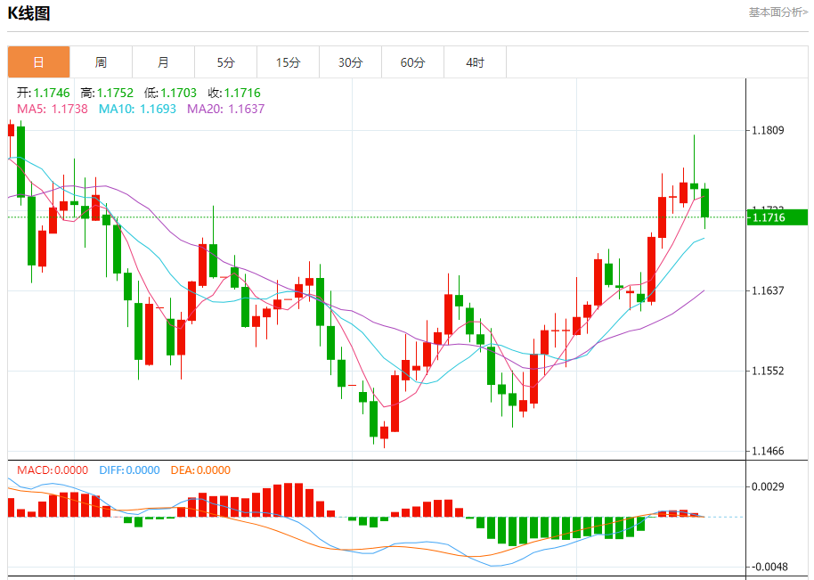 今日周三,截止目前欧元兑美元报1.1718,下跌0.25%。