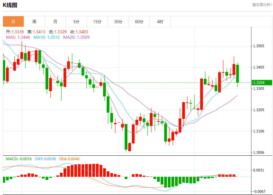 周三欧市盘中,英镑兑美元交投于1.3335,跌幅为0.63%。