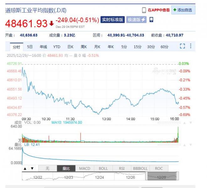 一、美股股市:截至收盘,道指跌249.04点,跌幅为0.51%,报48461.93点;纳指跌118.75点,跌幅为0.50%,报23474.35点;标普500指数跌24.20点,跌幅为0.35%,报6905.74点。美光科技(MU.US)涨3.4%,股价触及历史新高;特斯拉(TSLA.US)跌3.2%,英伟达(NVDA.US)跌1%。纳斯达克中国金龙指数收跌0.66%,阿里巴巴(BABA.US)跌超2%,蔚来汽车(NIO.US)涨5%。