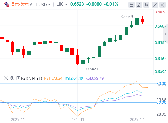 澳元/美元现徘徊于三周高点0.6650附近,14日RSI虽未超买但留有上行空间。若RBA转向鹰派,汇价或挑战9月17日高点0.6707,后续阻力位看向0.6750(心理关口)及0.6800(整数位)。下行方面,0.6600构成初始支撑,跌破后可能测试12月3日低点0.6553;更关键支撑位于0.6530附近,即50日与100日均线交汇处。