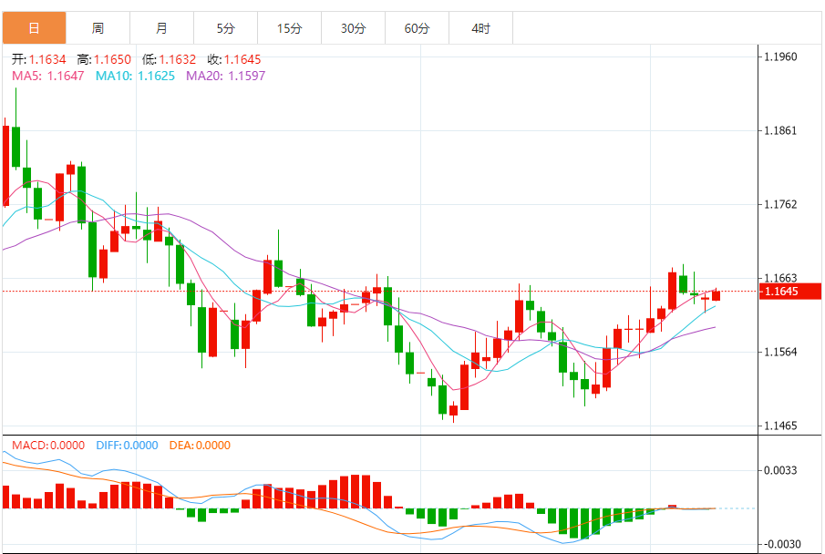 周二,欧元/美元徘徊于1.1645下方,现交投于1.1644附近,涨幅0.06%。