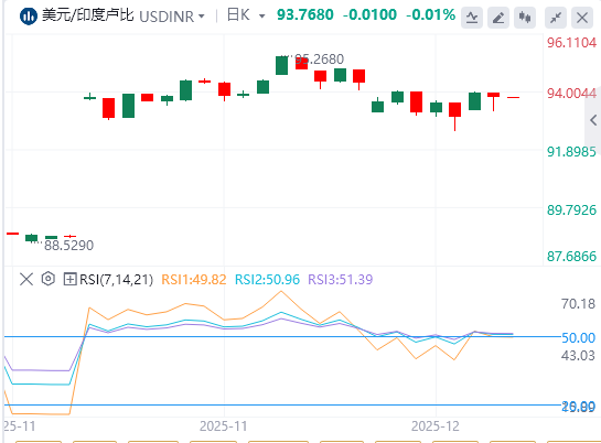 周三,印度卢比对美元进一步走强,美元兑卢比汇率跌至90.00附近,创近期新低。市场情绪受两大因素提振:一是美国副贸易代表里克·斯威策(Rick Switzer)宣布将于12月10日至11日访印,推动双边贸易谈判;二是投资者对美联储(Fed)货币政策转向的预期升温,美元指数(DXY)同步回落至99.20附近。