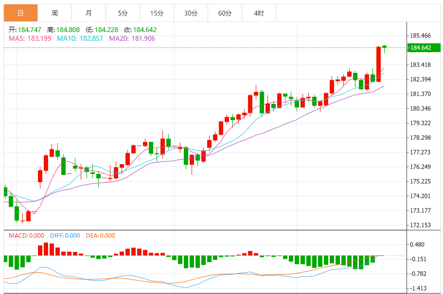 技术上,周五,欧元兑日元突破184.10关口,成功恢复了牛市行情,目标是触及184.75关口。