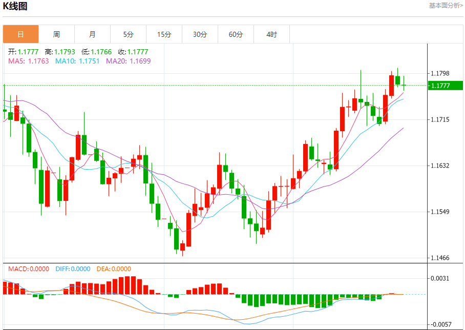 汇价高见1.1793,低见1.1766。上一交易日,汇价收于1.1794。