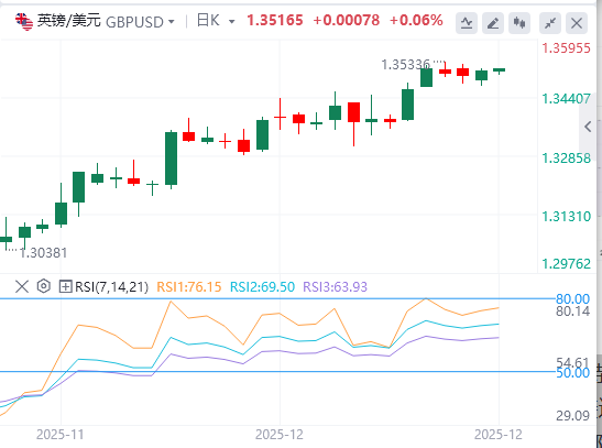 日线图中,英镑/美元稳守100日均线1.3335的上升趋势,保持多头形象。该指数也仍高于20日均线,强调趋势支撑。RSI(14)接近超买,为69.87。上布林带1.3550为当前的上半场。日收盘若突破该障碍,攀升将持续,而市场偏好仍偏多于EMA。