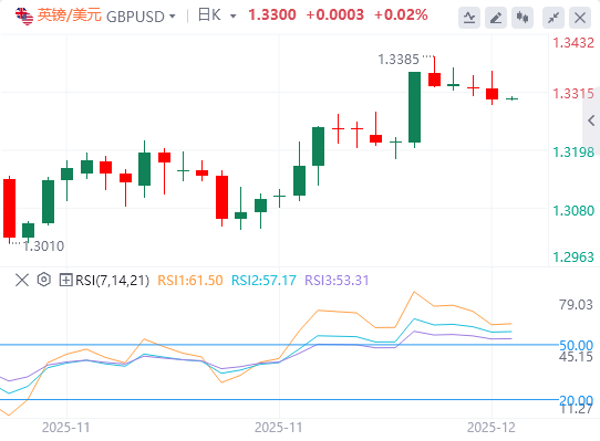 欧元:截至发稿,欧元/美元徘徊在1.1625附近。德国10月贸易差额显示169亿欧元盈余,较9月的153亿欧元上升,超出152亿欧元的预期,因为出口超过进口。此前,联邦银行行长约阿希姆·纳格尔保持中立,强调货币政策处于良好状态,未来一段时间内将保持不变。技术面上,如果欧元/美元维持在1.1585–1.1600支撑位之上,将朝1.1680附近的近期高点推进。