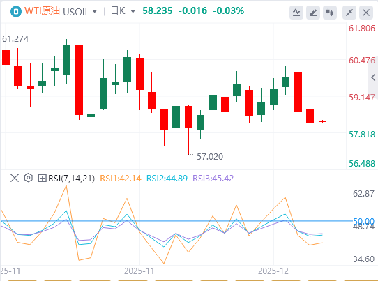 技术面:原油价格从短暂的希望转为明显的卖方主导,多个时间段内多次突破失败,价格直线冲击57.21美元,甚至可能跌至十月低点。对下降通道的尊重以及50日/20日集群的持续阻力使空头完全掌控;只有在59.86美元以上有说服力地推高并持有,才能开始打破这一说法。