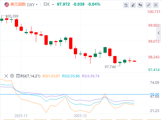 周一,美元指数低位横盘,最终收跌,截至目前,美元报价97.97。