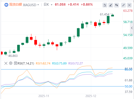 白银延续创新高节奏,当前最高达到61.29一线,涨幅进一步扩大,整体的交易重心持续不断上行。均线系统上,60均线高于100均线,且均线双双发散向上,形成看涨的多头排列之势,表明白银当下仍然处于强势多头中。操作上,依托下方的支撑,尝试逢低做多的操作思路,关注支撑位59.95一线,如若在此震荡企稳,可考虑布局多单,上行关注61.29一线的压力,若上破,则多头进一步测试62.00整数关口附近的压力。