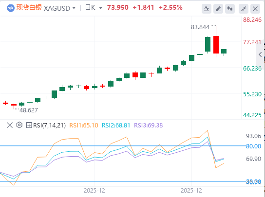 白银价格前期低位起涨后,保持稳步上行,近期价格上行速度有所加快,斜率有所放大,昨日跳空高开后到达83.87附近,随后价格快速回落。本轮回落是对前期大幅上涨的修复,但周线、月线级别上行趋势暂未结束,下方可关注布林带下轨对价格的支撑作用,该位置在68.75附近同样是前期行情启动点的关键支撑位。CCI指标从超卖区间附近拐头向上,或预示空头动能有所衰减。策略上建议等价格回调后,逢低做多博弈多单思路为主。
