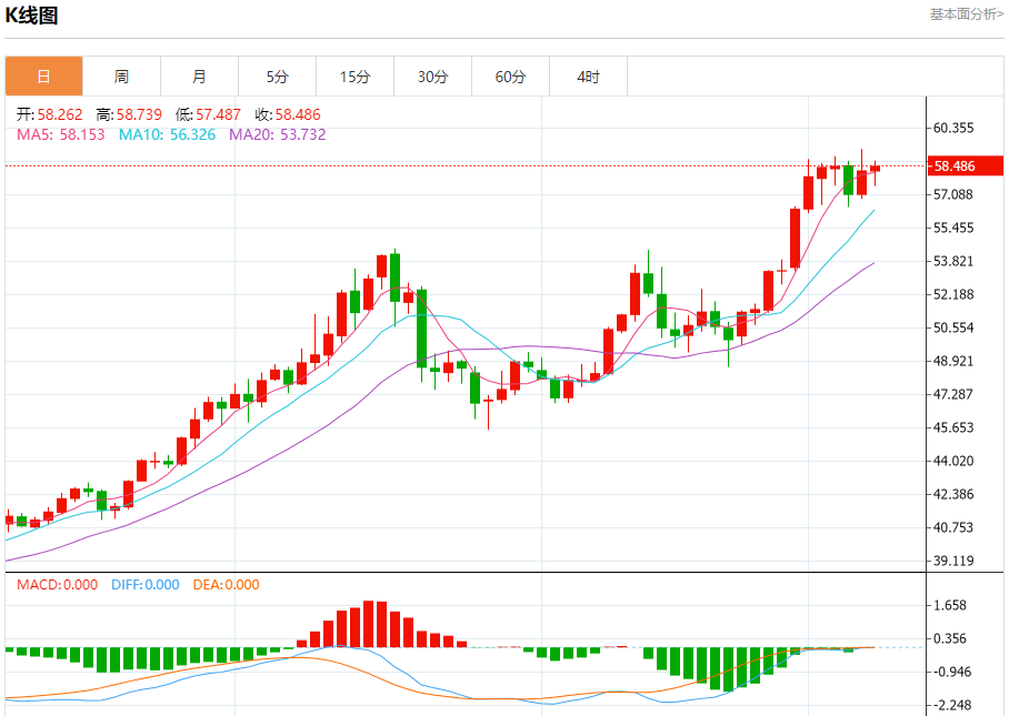 周一盘中,现货白银报58.488,涨幅0.40%。