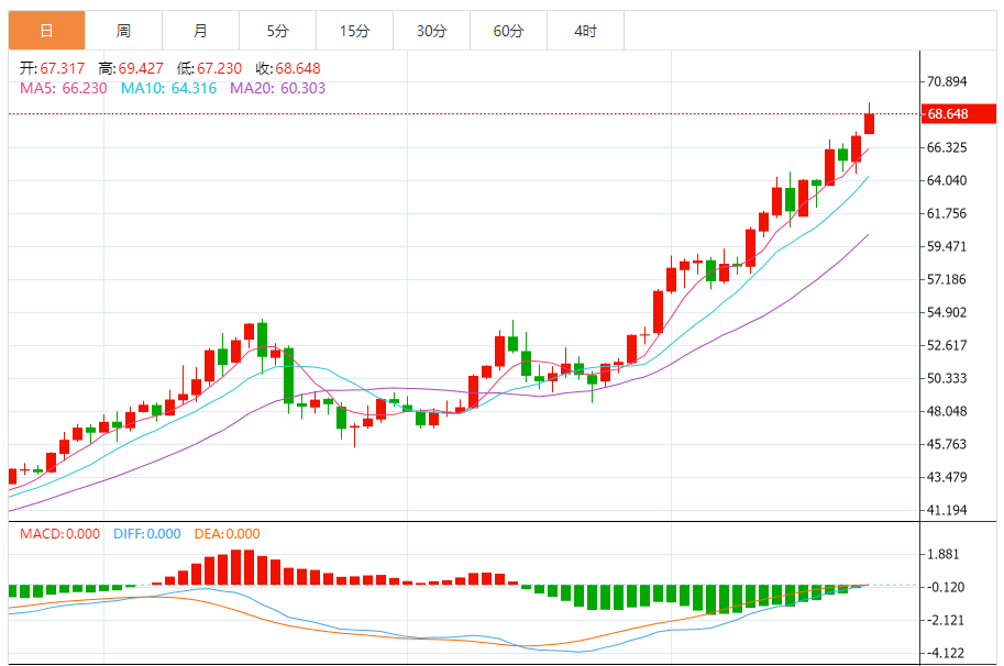 周一(12月22日),现货白银目前位于68.648美元/盎司附近,涨幅为2.27%。