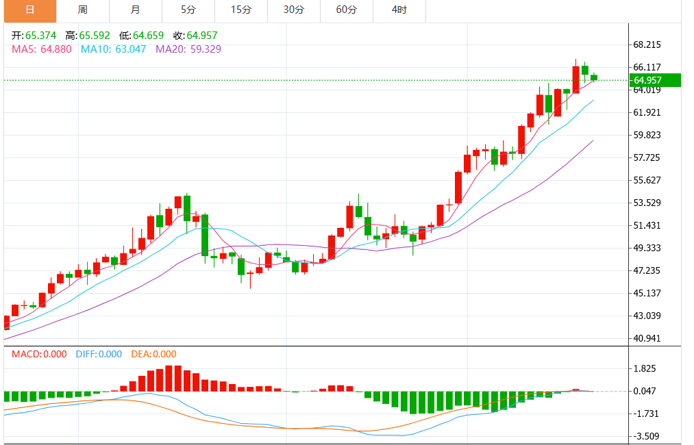 与此同时,小时/日线图上的相对强弱指数(RSI)位于70以上,发出超买信号,可能促使市场暂停。 100小时SMA上升至65.57美元,价格稳稳保持在其上方,保持短期趋势向上的偏向。 此外,移动平均收敛/发散(MACD)在正区域的0.19,持续上升,表明看涨动能在增强。