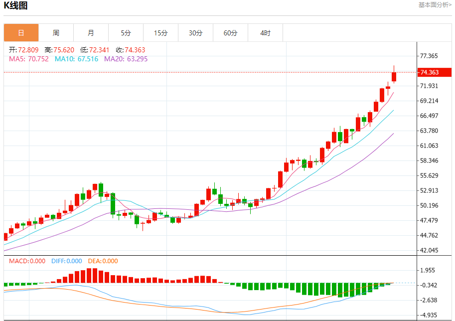 周五盘中,现货白银报74.372,涨幅3.60%。