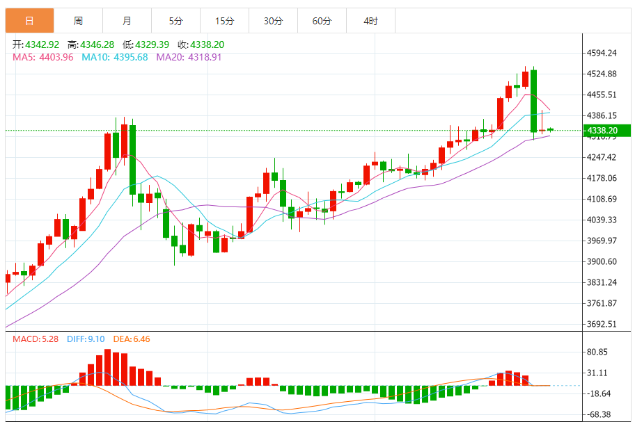 不过,好景不长,周二尾盘黄金回吐大部分涨幅,最终收报4338.54美元/盎司,仅微涨0.16%。