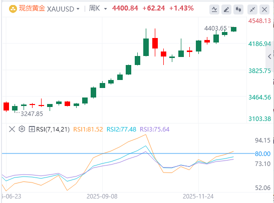 12月22日,周一欧市初盘,黄金上涨至历史新高,接近4300美元。随着美国美联储(Fed)预计降息,贵金属在美国通胀疲软和就业报告转冷的迹象下获得动力。较低的利率可以降低持有黄金的机会成本,从而支持这种无收益的贵金属。