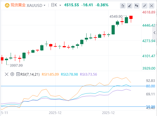 12月29日,周一亚市盘中,黄金价格从接近4550美元的历史高点回落,交易者在假期前完成部分获利了结。美元(USD)的升值也可能对贵金属造成压力,因为这使非美国买家的黄金价格上涨,从而压低价格。