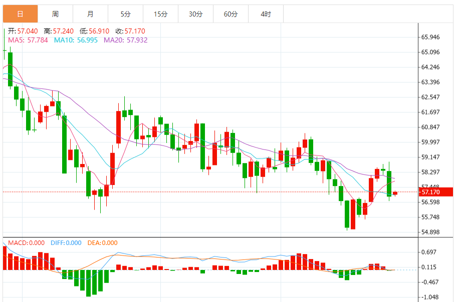 周一(12月29日),美原油价格交投于57.170美元/桶附近,涨幅为0.78%。