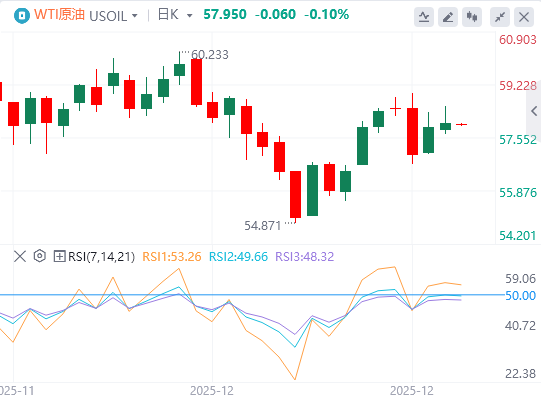 12月31日,原油(WTI)在连续两天上涨后回落,周三亚洲时段交易时段每桶约57.95美元。WTI指数12月下跌近3%,预计连续第五个月下跌,年均跌幅近20%。然而,本周早些时候原油价格上涨,投资者重新评估了俄乌和平协议希望的减弱,此前俄罗斯总统弗拉基米尔·普京官邸涉嫌遭袭。